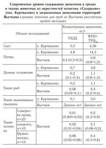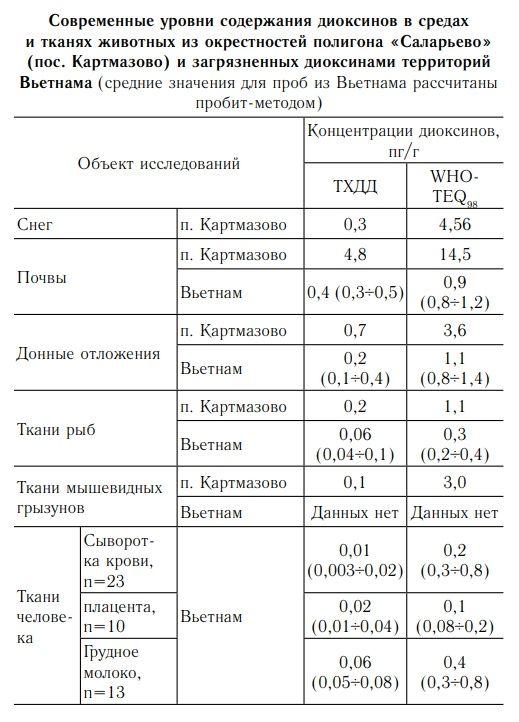 Появление диоксинов в тканях организмов из популяций, занимающих загрязненные этими веществами территории, свидетельствует о реальной опасности для здоровья и развития. При этом закономерности проникновения диоксинов из окружающей среды в организм определяют локальные особенности экотоксикокинетики этих веществ и связанный с ней временной фактор. В наших исследованиях промежутки времени, прошедшие с начала эксплуатации ПС (первая половина 1960-х) и применения армией США во Вьетнаме содержащей диоксин рецептуры «Оранжевый агент» (1962–1971), оказались практически одинаковыми. Это совпадение позволило предположить сходную направленность векторов перераспределения диоксинов между средами, а также поступления их в организмы.