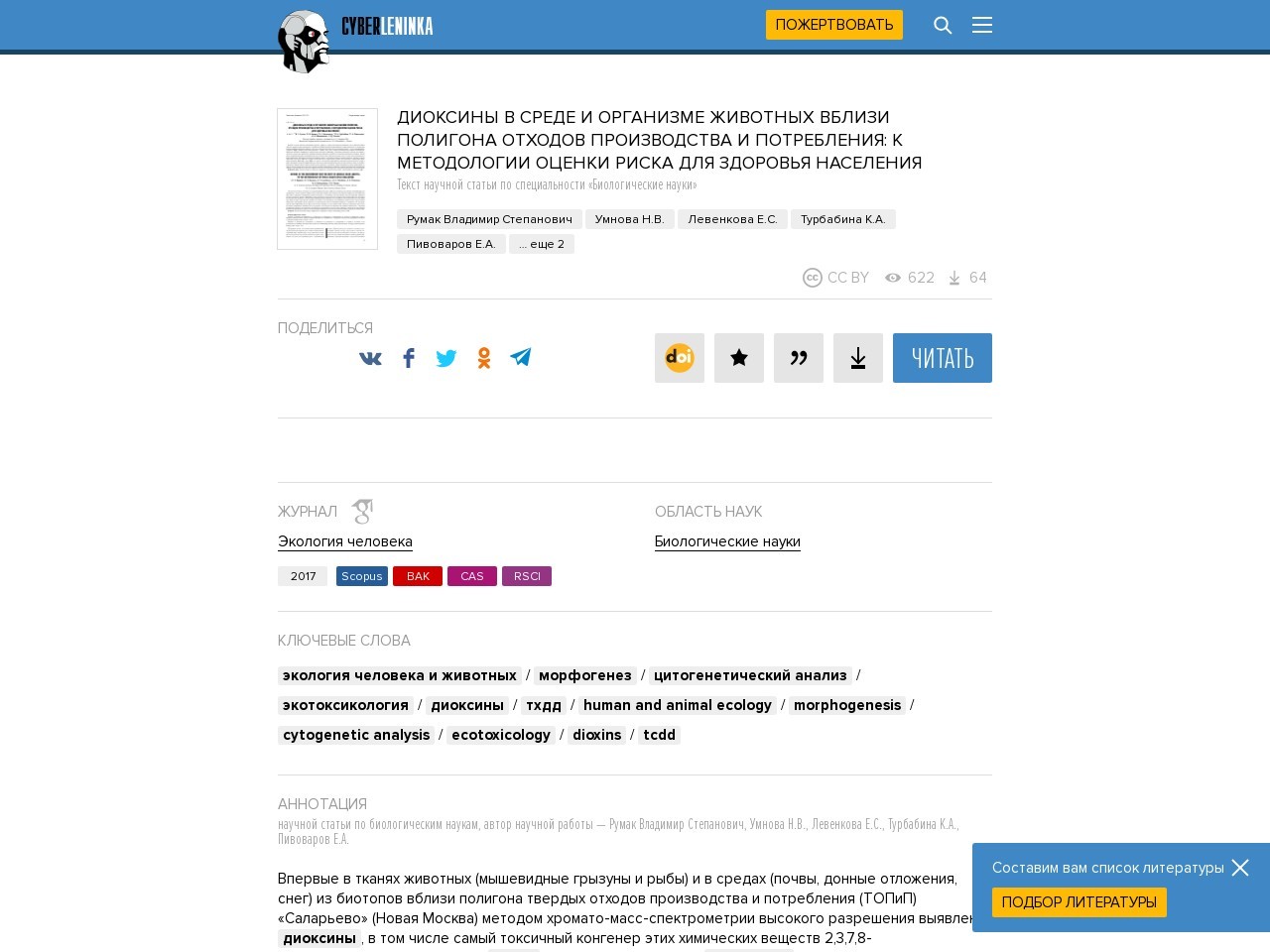 Впервые в тканях животных (мышевидные грызуны и рыбы) и в средах (почвы, донные отложения, снег) из биотопов вблизи полигона твердых отходов производства и потребления (ТОПиП) «Саларьево» (Новая Москва) методом хромато-масс-спектрометрии высокого разрешения выявлены диоксины, в том числе самый токсичный конгенер этих химических веществ 2,3,7,8-тетрахлордибензоп-диоксин (ТХДД). Профили конгенеров диоксинов в пробах почв, снега и донных отложений были хорошо сопоставимыми. Параметры показателя «коэффициент эквивалентной токсичности» (WHO-TEQ98) многократно превышали значения, при которых у населения загрязненных диоксинами территорий экоцида во Вьетнаме возникала так называемая диоксиновая патология. В отношении предельно допустимых концентраций для почв значения этого показателя оказались почти в 38 раз выше установленных в России нормативов. Последствия влияния загрязняющих веществ на состояние животных отражали результаты изучения и оценки проявлений токсических эффектов на уровне целого организма и хромосомного аппарата, во взаимосвязи с параметрами содержания диоксинов (WHO-TEQ98) и/или ТХДД в их тканях и естественной среде обитания. Изменения цитогенетического статуса у рыб и мышевидных грызу нов, морфометрических показателей возрастной динамики развития рыб, появление среди них особей с аномалиями строения соответствовали патологическим процессам и состояниям, которые определяют патогенез диоксиновой патологии. Анализ совокупности полученных данных достоверно иллюстрирует возможность создания универсального методического подхода к скрининговой оценке риска для здоровья населения малых доз диоксинов, загрязняющих среду вблизи полигонов ТОПиП. Предварительная, так называемая скрининговая, оценка риска для здоровья населения экотоксикантов, загрязняющих окружающую среду, призвана решать проблемы выбора требующих первоочередного внимания объектов исследований (далее скрининговая оценка). Прогностическую ценность научных рекомендаций такому выбору определяют показатели, используемые для оценки риска, которые совершенствуют по мере появления новых научных данных. Диоксины и диоксиноподобные суперэкотоксиканты (далее диоксины) являются самыми опасными и все еще мало изученными загрязняющими веществами. Проблему оценки вредного действия малых доз этих веществ на организмы в условиях хронической экспозиции разрабатывают системно. К группе диоксинов относят полихлорированные соединения дибензо-п-диоксинов (включая самый токсичный для животных конгенер – 2,3,7,8-тетрахлордибензо-п-диоксин – ТХДД), дибензофуранов и бифенилов. Загрязнение этими веществами сред городских и сельских поселений может быть следствием эксплуатации полигонов твердых отходов производства и потребления (ТОПиП) – активных источников образования диоксинов и их эмиссии в окружающую среду. Возможность экспозиции и вредного действия малых доз диоксинов на организмы обитателей биотопов, расположенных вблизи ТОПиП, до сих пор не изучали. Скрининговую оценку объектов обычно выполняют путем сопоставления эмпирических данных с санитарно-гигиеническими или экологическими нормативами, например предельно допустимыми концентрациями (ПДК). В случаях оценки опасности диоксинов, загрязняющих среду, опора только на нормативы не все
