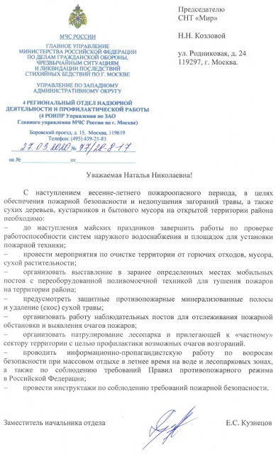 Уважаемые члены СНТ “МИР” Сообщаем вам, что в связи с распространением коронавирусной инфекции субботники в 2020 году отменены. Просим всех членов Товарищества: -организовать выброс мусора исключительно в контейнер, -производить уборку на своих участках и прилегающей территории, -обрезать ветви деревьев, мешающие проезду а/м, -удалять сухостой со своих участков. Напоминаем также о соблюдении правил пожарной безопасности. Не сжигайте траву, листву и прочие растительные остатки, компостируйте их. Помните ,что дым плачевно сказывается на состоянии дыхательной системы. Особенно сильно это ощущают аллергики, дети и люди преклонного возраста.