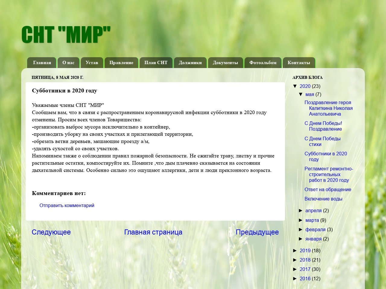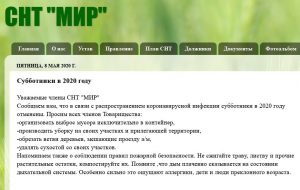 Уважаемые члены СНТ “МИР” Сообщаем вам, что в связи с распространением коронавирусной инфекции субботники в 2020 году отменены. Просим всех членов Товарищества: -организовать выброс мусора исключительно в контейнер, -производить уборку на своих участках и прилегающей территории, -обрезать ветви деревьев, мешающие проезду а/м, -удалять сухостой со своих участков. Напоминаем также о соблюдении правил пожарной безопасности. Не сжигайте траву, листву и прочие растительные остатки, компостируйте их. Помните ,что дым плачевно сказывается на состоянии дыхательной системы. Особенно сильно это ощущают аллергики, дети и люди преклонного возраста.