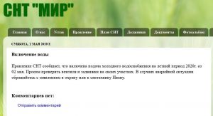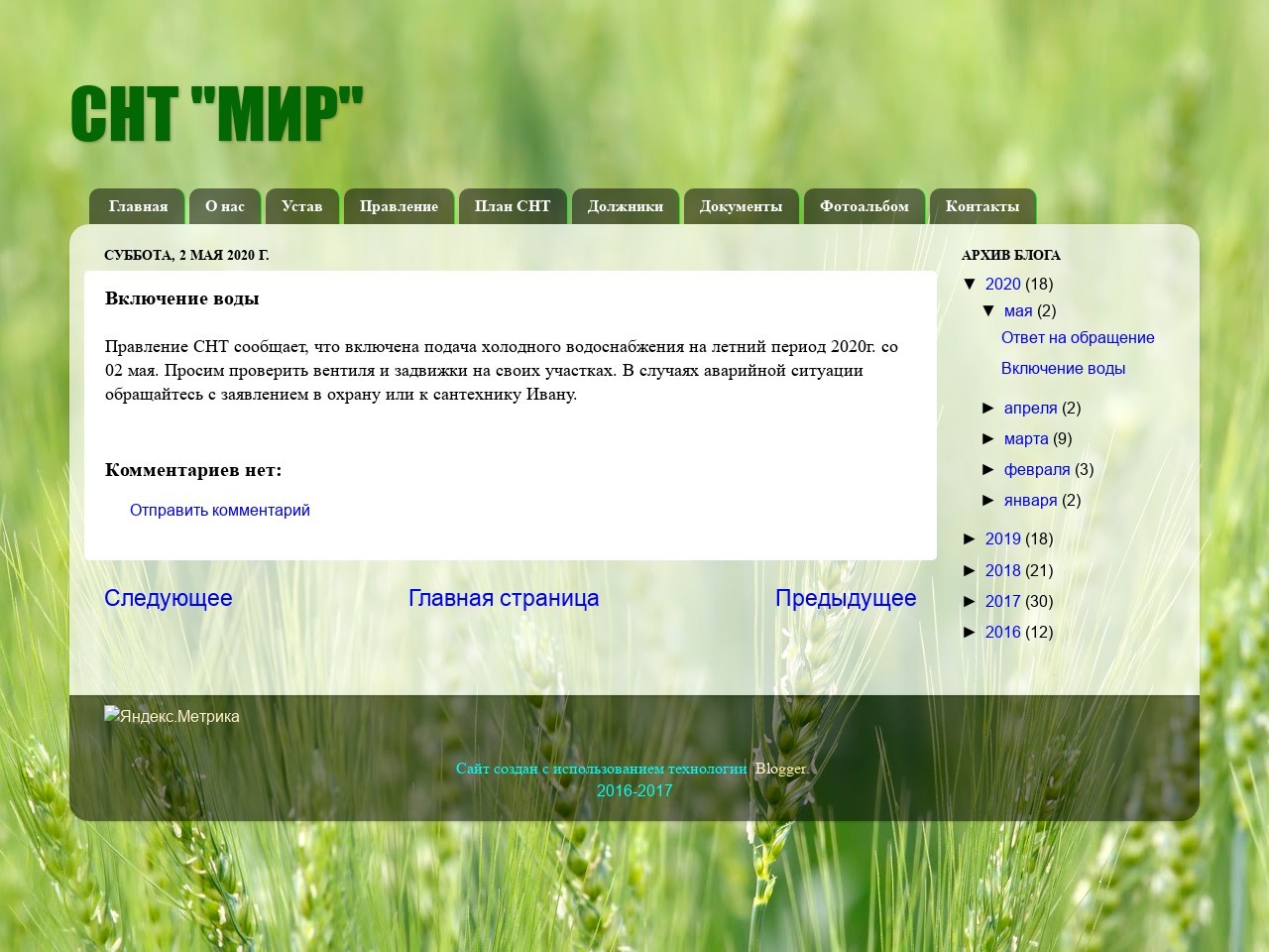 Правление СНТ «МИР» сообщает, что со 02 мая включено холодное водоснабжении на летний период 2020г. Просим проверить вентили и задвижки на своих участках. В случаях аварийной ситуации обращайтесь с заявлением в охрану или к сантехнику Ивану.