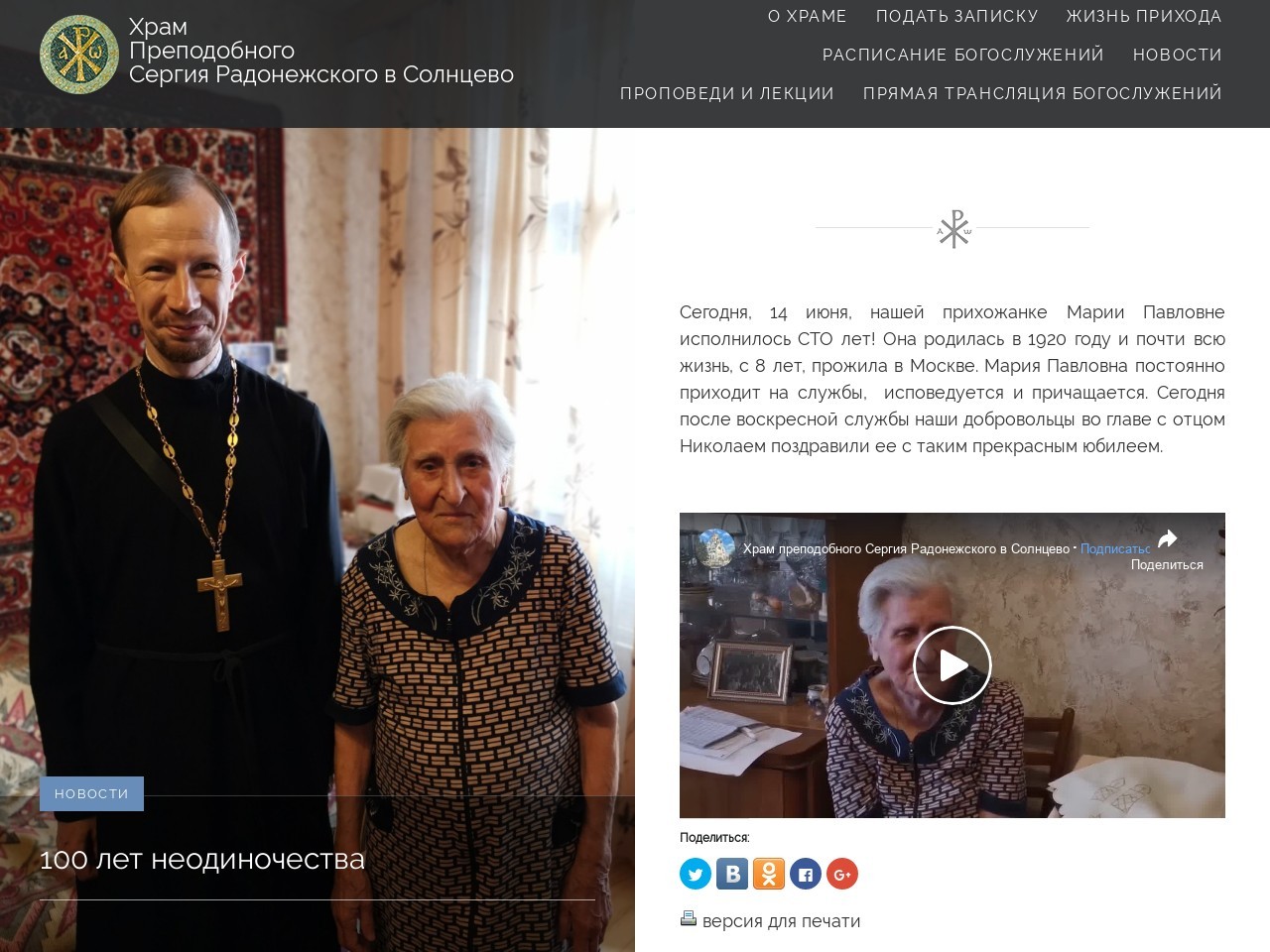 14 июня, прихожанке храма Сергия Радонежкого в Солнцево Марии Павловне исполнилось 100 лет! Она родилась в 1920 году и почти всю жизнь, с 8 лет, прожила в Москве. После воскресной службы добровольцы во главе с отцом Николаем поздравили ее с таким прекрасным юбилеем.
