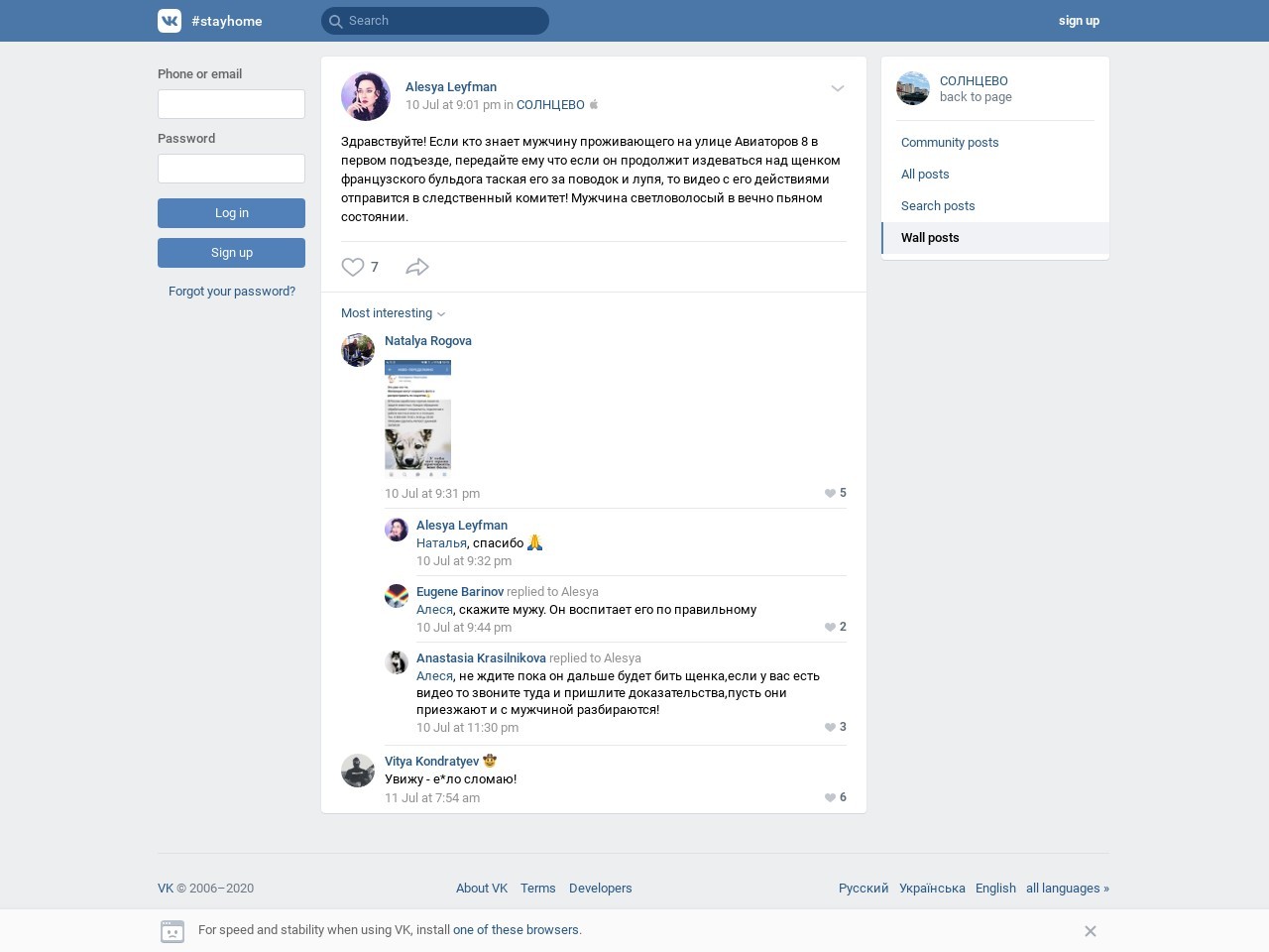 Здравствуйте! Если кто знает мужчину проживающего на улице Авиаторов 8 в первом подъезде, передайте ему что если он продолжит издеваться над щенком французского бульдога таская его за поводок и лупя, то видео с его действиями отправится в следственный комитет! Мужчина светловолосый в вечно пьяном состоянии.