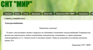 В связи с наступлением зимнего периода и во избежание отключения электроснабжения Товарищества, просим вас пересмотреть личное потребление электричества, отказавшись от энергозатратных электроприборов (в т.ч. теплых полов и тепловых пушек). Также не допускается установка автоматов свыше 25А.